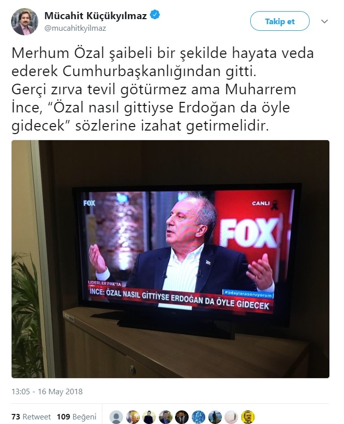 Cumhurbaşkanı Erdoğan'ın kaybederse gidip gitmeyeceği sorusuna, "Kaybederse nasıl gitmez, Süleyman Demirel 6 kere nasıl gittiyse öyle gidecek" dedikten sonra, Eski Cumhurbaşkanı Turgut Özal'ın şüpheli bir şekilde ölümünü 'unutarak' "Turgut Özal nasıl gittiyse o da öyle gidecek" sözlerini sarf etmesi, hemen ardından FOX TV'nin de bu sözlere KJ'de yer vermesi, sosyal medyada tepki aldı.