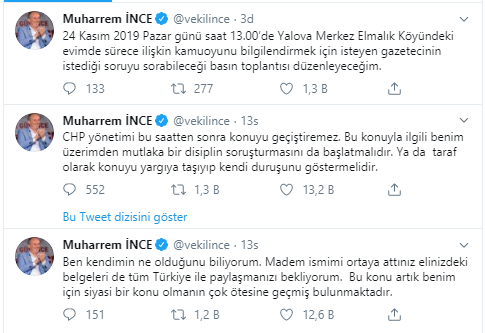 Kamuoyunu bilgilendirmek amacıyla Yalova Merkez Elmalık Köyündeki evinde basın toplantısı düzenleyeceğini ifade eden İnce, isteyen gazetecinin istediği soruyu sorabileceğini söyledi.