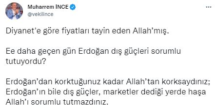 Diyanet’e göre fiyatları tayin eden Allah'mış. Ee daha geçen gün Erdoğan dış güçleri sorumlu tutuyordu? Erdoğan'dan korktuğunuz kadar Allah'tan korksaydınız; Erdoğan'ın bile dış güçler, marketler dediği yerde haşa Allah'ı sorumlu tutmazdınız.