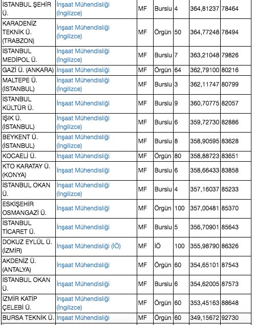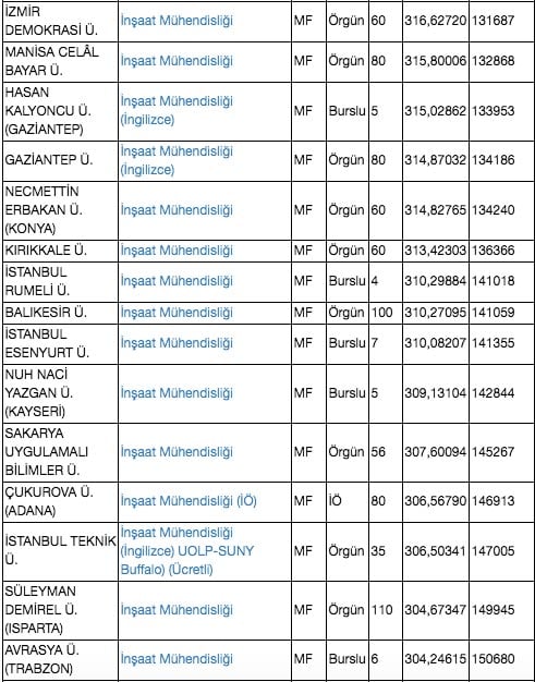 NİĞDE ÖMER HALİSDEMİR ÜNİVERSİTESİ İnşaat Mühendisliği taban puanları
