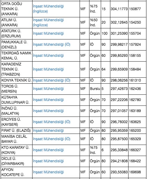 ATATÜRK ÜNİVERSİTESİ (ERZURUM)İnşaat Mühendisliği (İÖ) taban puanları