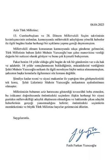 "Milletimizin babamın aziz hatırasına gösterdiği teveccühü heba etmeden, bu istikamet doğrultusunda önümüzdeki seçimlere ilişkin herhangi bir siyasi partiden milletvekilliği adaylık düşüncem olmadığını ve hakkımda çıkan adaylık haberlerinin gerçeği yansıtmadığını belirtir; önümüzdeki seçimlerin memleketimiz ve büyük Türk milletine hayırlar getirmesini dilerim."