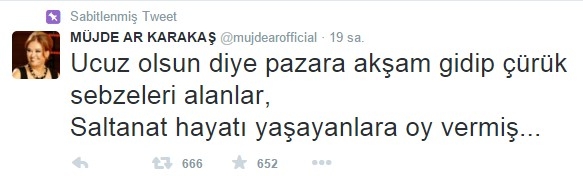 Ar, paylaştığı aptalca tweette, "Ucuz olsun diye pazara akşam gidip çürük sebzeleri alanlar, saltanat hayatı yaşayanlara oy vermiş..." yorumunda bulundu.
