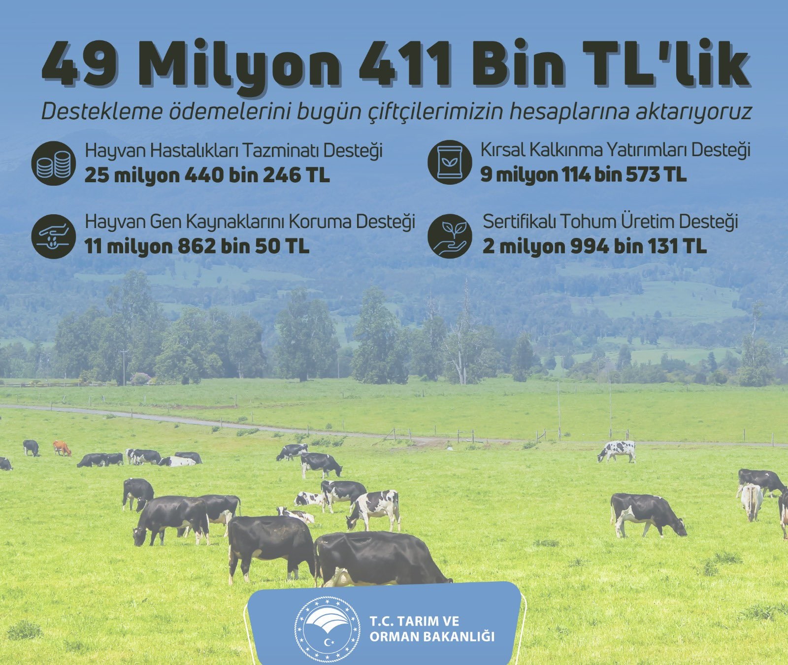 Bakan Kirişçi, sosyal medya hesabından yaptığı duyuruda, “49 milyon 411 bin TL’lik tarımsal destekleme ödemelerini bugün çiftçilerimizin hesaplarına aktarıyoruz” ifadelerini kullandı.