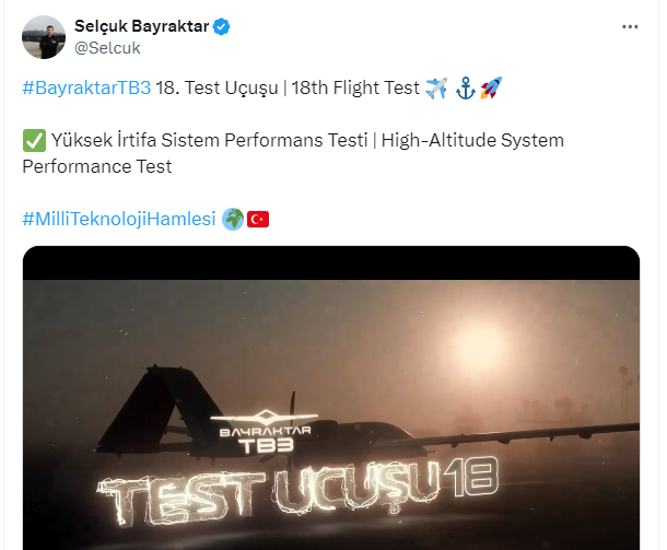 Bayraktar, TB3'ün Yüksek İrtifa Sistem Performans Testi'ne tabi tutulduğunu aktardı. 18. test uçuşu başarıyla tamamlandı.