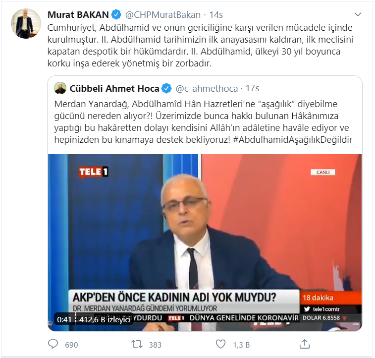 TELE 1 ekranlarında yayınlanan ve sunuculuğunu kanalın genel yayın yönetmeni Merdan Yanardağ'ın yaptığı 18 dakika isimli programda Osmanlı İmparatorluğu'nun 34'üncü padişahı 2'nci Abdülhamid ile ilgili skandal sözler söylenmişti. Yanardağ'ın, 2. Abdülhamid ile ilgili "emperyalizmin uşağı aşağılık bir diktatör" ifadelerini kullanması büyük tepki çekmişti.