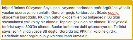 İçişleri Bakanı Süleyman Soylu, Gara operasyonunun detaylarına ilişkin önemli bilgiler verdi. İçişleri Bakanı Süleyman Soylu, Gara'ya giden HDP'li vekilin Dilan Taşdemir olduğunu açıkladı. Bakan Soylu, Gara operasyonunun önemine vurgu yaparak, "Gara'da bunu yaptığınız andan itibaren kalbe girmiş gibisinizdir. Bugün TSK'nın yaptığı operasyon tam olarak budur. Bizim o koridoru kapatmamız, eğitim alanlarını bertaraf etmemiz, bütün aktarım merkezlerinin kalbine girmemiz ve düze inmemiz terör örgütün bütün sıkıntısıdır, bugünkü feryadının nedeni de budur.” dedi.