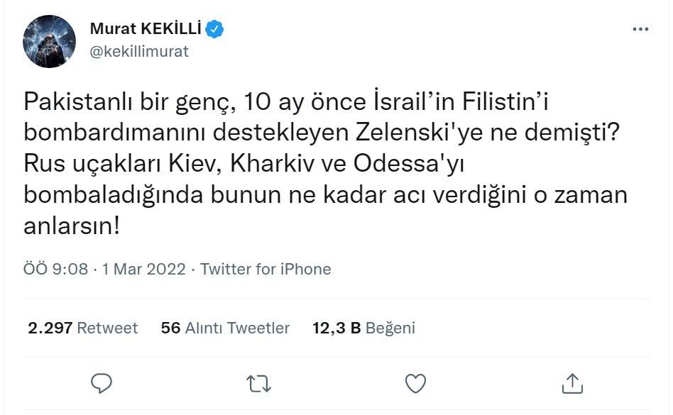 Şarkıcı Murat Kekilli sosyal medya hesabı Twitter'dan bir paylaşım yaptı. Kekilli'nin iddiasına göre 10 ay önce İsrail Filistin'i bombardımana tutarken bunu destekleyen Zelenski'ye Pakistanlı bir genç Rus uçakları Kiev, Kharkiv ve Odessa bombalandığında yaşayacağı acı konusunda uyarmıştı.