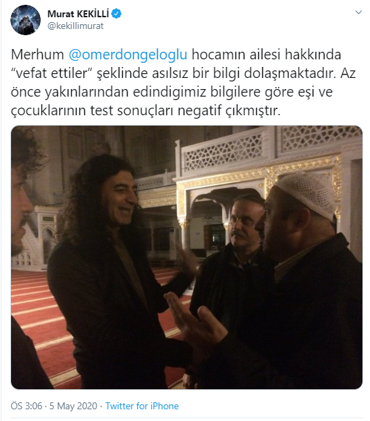 Murat Kekili, Ömer Döngeloğlu Hoca'nın eşi Zeynep Döngeloğlu'na ilişkin yaptığı paylaşımda, "Merhum Ömer Döngeloğlu, hocamın ailesi hakkında “vefat ettiler” şeklinde asılsız bir bilgi dolaşmaktadır. Az önce yakınlarından edindigimiz bilgilere göre eşi ve çocuklarının test sonuçları negatif çıkmıştır" dedi.