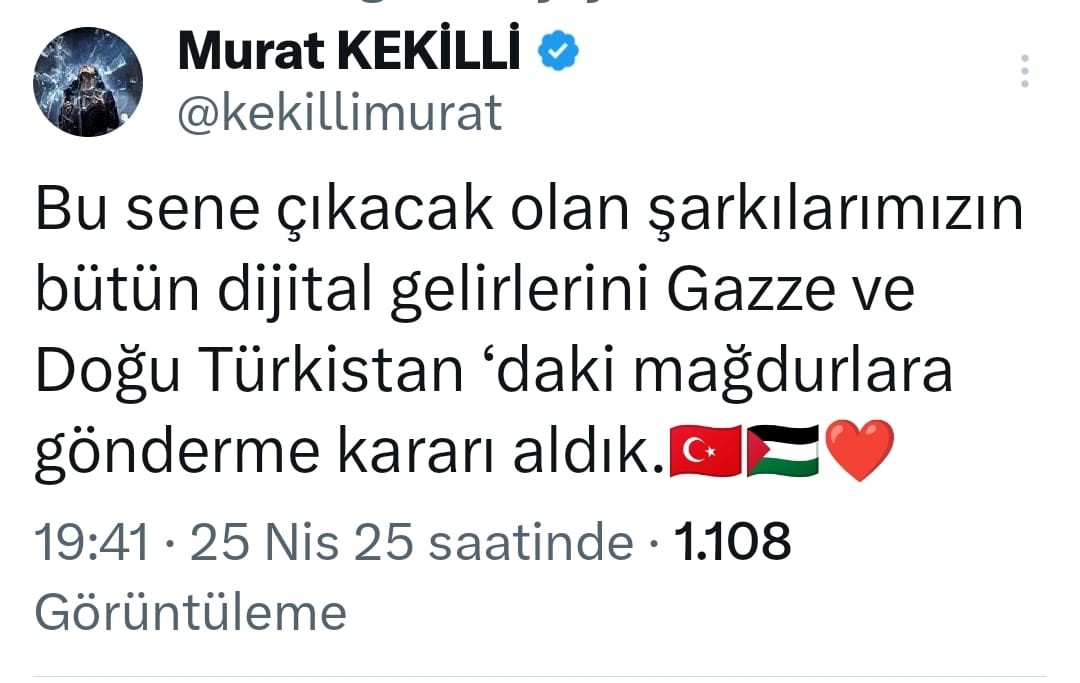 Murat Kekilli, bu yılki dijital gelirlerinin Gazze ve Doğu Türkistan'a gönderileceğini açıkladı.