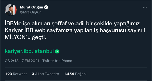 Twitter'dan bir paylaşım yapan Ongun, "İBB'de işe alımları şeffaf ve adil bir şekilde yaptığımız Kariyer İBB web sayfamıza yapılan iş başvurusu sayısı 1 MİLYON’u geçti." ifadesini kullandı.