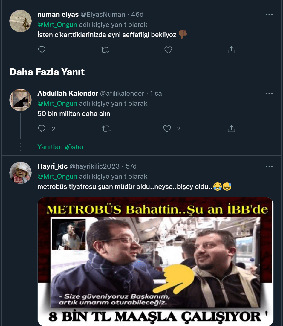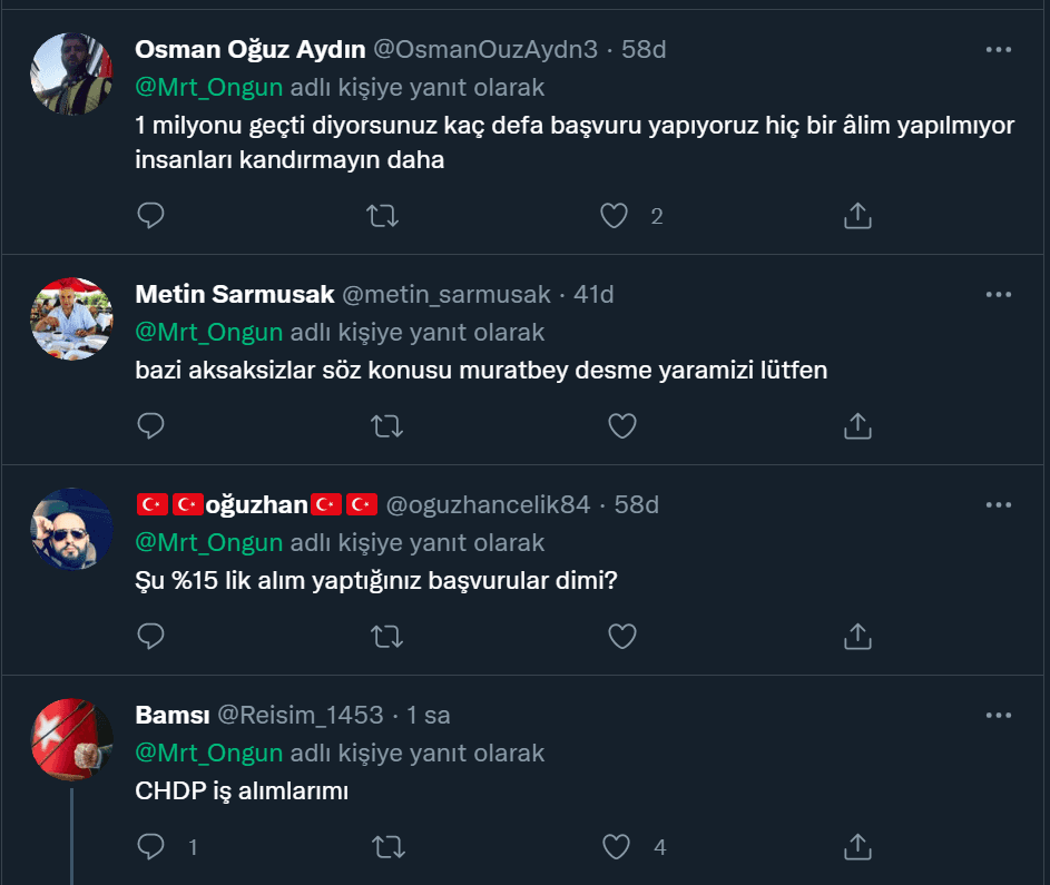 CHP'li İBB Sözcüsü Murat Ongun, belediyenin işe alımları şeffaf ve adil bir şekilde yaptığını ileri sürdü. Ongun'un paylaşımının altına, "İYİ Parti üzerinden aldığınız güvenliklerden haberimiz yok sanıyorsunuz, mezarlıklara HDP üzerinden alınan güvenlikleri hiç söylemiyorum" benzeri yorumlar geldi. Ayrıca CHP'li Özgür Nas'ın "100 kişi alınıyorsa CHP'den 35, İYİ Parti'den 15, Diğerleri 15, İBB kariyer üzerinden ise 20-25 gidiyor" şeklindeki sözleri de tekrar gündem oldu.