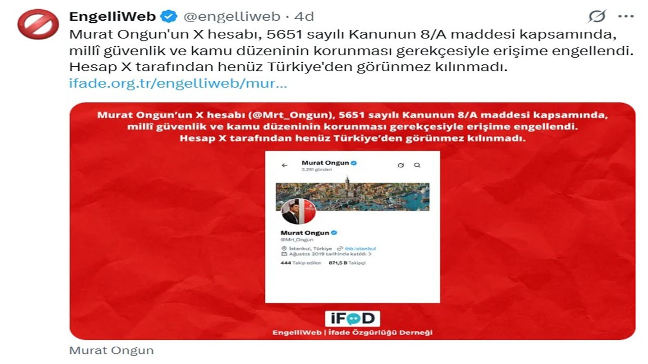 Engelli Web, Ongun'un hesabına getirilen erişim engeli kararını "Murat Ongun'un X hesabı, 5651 sayılı Kanunun 8/A maddesi kapsamında, millî güvenlik ve kamu düzeninin korunması gerekçesiyle erişime engellendi. Hesap X tarafından henüz Türkiye'den görünmez kılınmadı" paylaşımı ile duyuruldu.