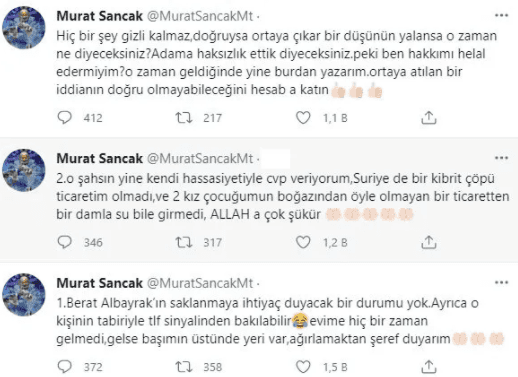 Sancak sosyal medya hesabı Twitter üzerinden yaptığı açıklamada şu ifadelere yer vererek "Berat Albayrak’ın saklanmaya ihtiyaç duyacak bir durumu yok. Ayrıca o kişinin tabiriyle telefon sinyalinden bakılabilir. Evime hiçbir zaman gelmedi, gelse başımın üstünde yeri var, ağırlamaktan şeref duyarım. O şahsın yine kendi hassasiyetiyle cevap veriyorum, Suriye'de bir kibrit çöpü ticaretim olmadı ve 2 kız çocuğumun boğazından öyle olmayan bir ticaretten bir damla su bile girmedi, Allah'a çok şükür. Hiç bir şey gizli kalmaz, doğruysa ortaya çıkar bir düşünün yalansa o zaman ne diyeceksiniz? Adama haksızlık ettik diyeceksiniz. Peki ben hakkımı helal ede miyim? O zaman geldiğinde yine buradan yazarım. Ortaya atılan bir iddianın doğru olmayabileceğini hesaba katın" ifadesini kullandı.