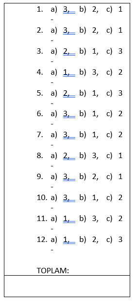 Şimdi aşağıya inip verdiğiniz cevaplara karşılık gelen puanları toplayın ve yetkinlik skorunuzu bulun.