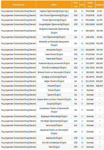 Muş Alparslan Üniversitesi 4 yıllık taban puanları 2021 yüzdelik dilimleri ve kontenjan sayıları kaçtır?