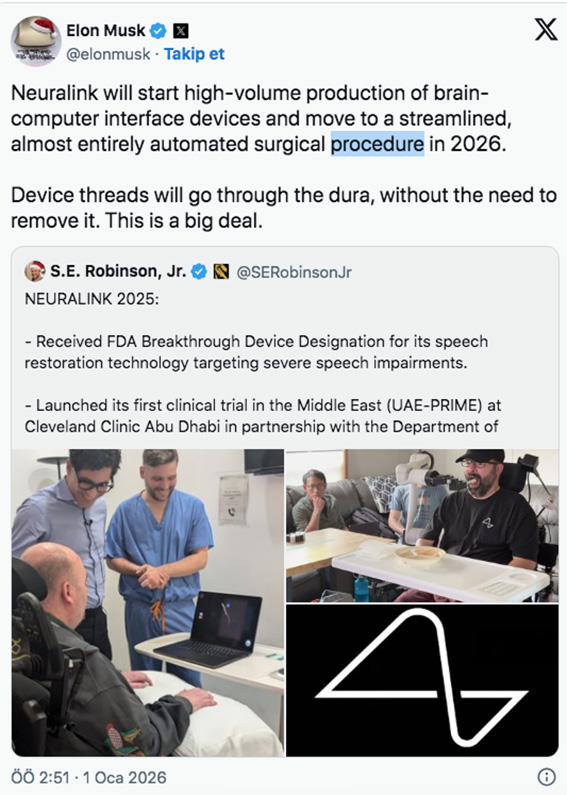 Elon Musk, Neuralink’in 2026’da beyin-bilgisayar arayüzü cihazlarını kitlesel üretime geçireceğini ve devreye alınacak otomatik cerrahi süreçlerle operasyonların çok daha hızlı ve verimli hale geleceğini açıkladı.