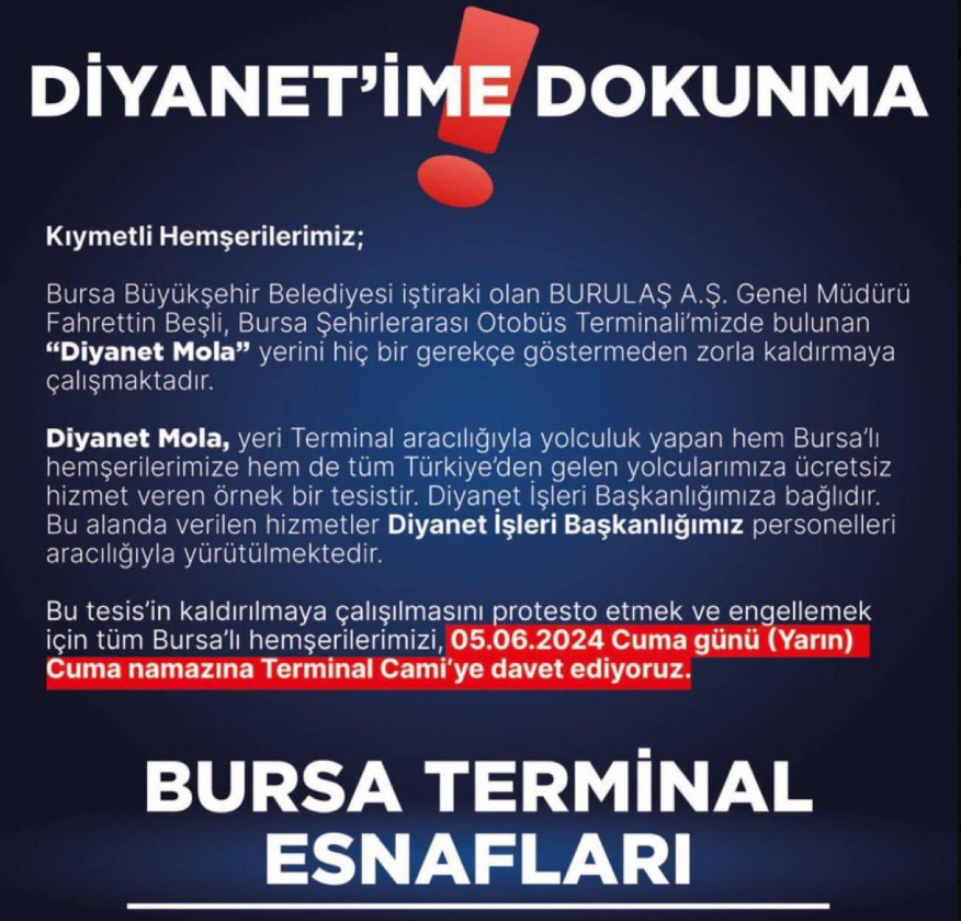 “Kıymetli hemşehrilerimiz; Bursa Büyükşehir Belediyesi iştiraki olan Burulaş A.Ş Genel Müdürü Fahrettin Beşli, Bursa Şehirlerarası Otobüs Terminali’mizde bulunan “Diyanet Mola” yerini hiçbir gerçekçe göstermeden zorla kaldırmaya çalışmaktadır. Diyanet Mola, yeri Terminal aracılığıyla yolculuk yapan hem Bursalı hemşehrilerimize hem de tüm Türkiye’den gelen yolcularımıza ücretsiz hizmet veren örnek bir tesistir. Diyanet İşleri Başkanlığımıza bağlıdır. Bu alanda verilen hizmetler Diyanet İşleri Başkanlığımız personelleri aracılığıyla yürütülmektedir. Bu tesisin kaldırılmaya çalışılmasını protesto etmek ve engellemek için tüm Bursa’lı hemşehrilerimizi, 05.06.2024 Cuma günü Cuma namazına Terminal Camii’ye davet ediyoruz.”