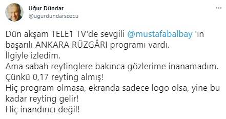 Kanal logosunun bile Mustafa Balbay’dan daha fazla reyting alacağını söyleyen Dündar, "Dün akşam TELE1 TV'de sevgili Mustafa Balbay'ın başarılı ANKARA RÜZGÂRI programı vardı. İlgiyle izledim. Ama sabah reytinglere bakınca gözlerime inanamadım. Çünkü 0,17 reyting almış! Hiç program olmasa, ekranda sadece logo olsa, yine bu kadar reyting gelir! Hiç inandırıcı değil!" dedi.