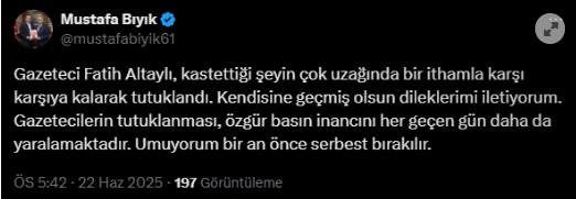 28Şubat sürecinde, belki kendisinin de başörtülü akrabası var ise onlara küfür eden Fatih Altaylı'nın, şimdi duvara toslayıp, Cumhurbaşkanını tehdit ettiği için tutuklanmasına Yomra Belediye Başkanı Mustafa Bıyık, sosyal medya hesabından paylaşım desteğinde bulundu. İyi Parti'den seçime girip sonra CHP'ye geçen Bıyık, "Gazeteci Fatih Altaylı, kastettiği şeyin çok uzağında bir ithamla karşı karşıya kalarak tutuklandı. Kendisine geçmiş olsun dileklerimi iletiyorum. Gazetecilerin tutuklanması, özgür basın inancını her geçen gün daha da yaralamaktadır. Umuyorum bir an önce serbest bırakılır." dedi.