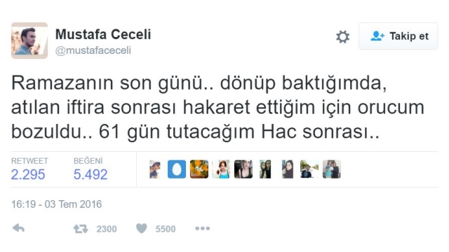 Kendisi hakkında oruç tutmuyor iddialarını ortaya atanlara sert bir üslüpla cevap veren Mustafa Ceceli attığı tweette söyledikleri yüzünden orucunun bozulduğunu ve Hac sonrası 61 gün oruç tutacağını yazdı.