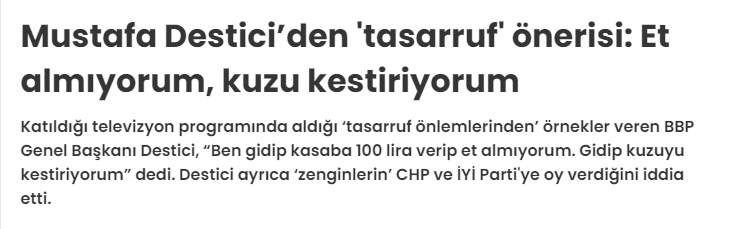 Büyük Birlik Partisi Genel Başkanı Mustafa Destici, et fiyatlarına ilişkin yaptığı bir paylaşımında, fiyattan tasarruf etmek için, eti canlı hayvan kestirerek temin ettiğini söyledi. Destici'nin açıklamaları bağlamından kopartılıp, CHP yandaşı medya tarafından hedef alındı.