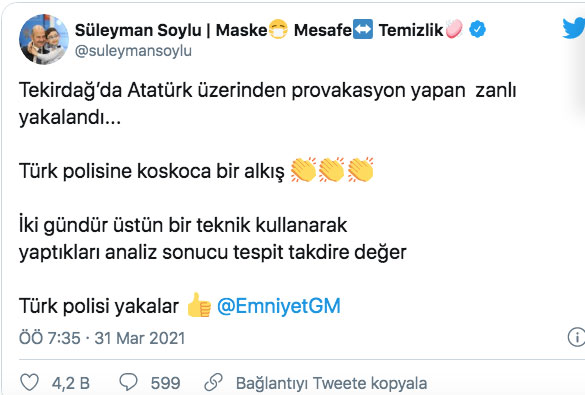 İçişleri Bakanı Süleyman Soylu, Twitter hesabından yaptığı paylaşımda, "Tekirdağ'da Atatürk üzerinden provokasyon yapan zanlı yakalandı. Türk polisine koskoca bir alkış." ifadelerini kullandı. Zanlıyı yakalayan ekibin, iki gündür üstün bir teknik kullanarak yaptıkları analiz sonucu yaptıkları tespitin takdire değer olduğunu vurgulayan Soylu, "Türk polisi yakalar." değerlendirmesinde bulundu.