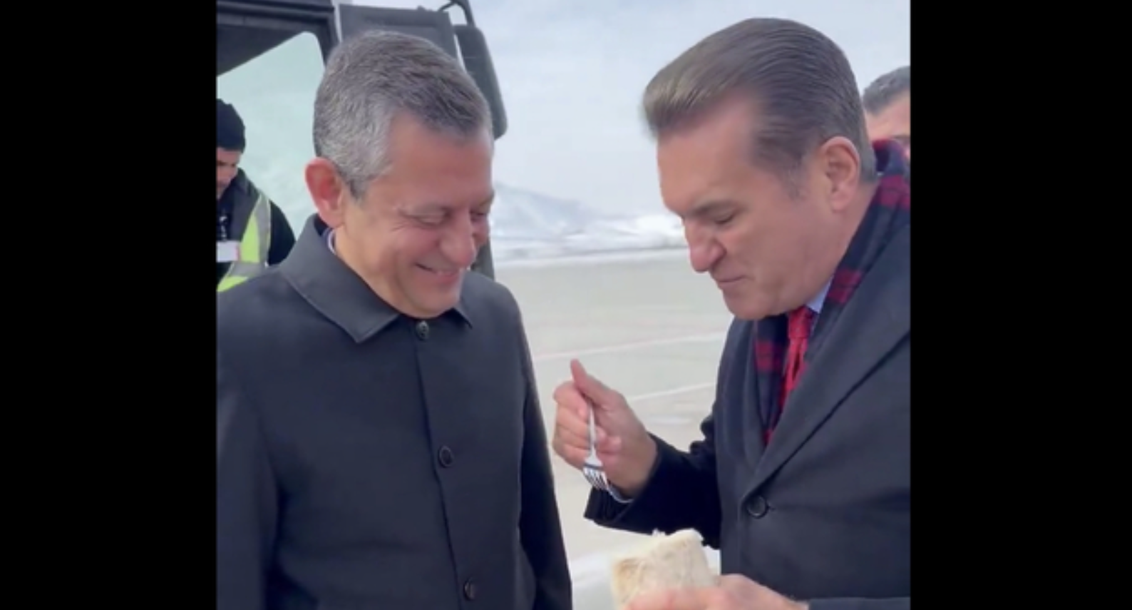 CHP Erzincan Milletvekili Mustafa Sarıgül, Erzincan'a gelen CHP lideri Özgür Özel'e uçaktan iner inmez tulum peyniri ikram etti