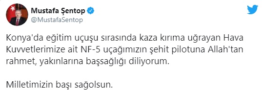 Şentop, sosyal medya hesabından yaptığı paylaşımda, "Konya'da eğitim uçuşu sırasında kaza kırıma uğrayan Hava Kuvvetlerimize ait NF-5 uçağımızın şehit pilotuna Allah'tan rahmet, yakınlarına baş sağlığı diliyorum. Milletimizin başı sağ olsun" ifadelerini kullandı.