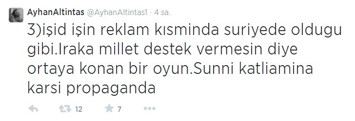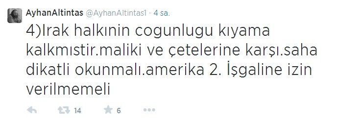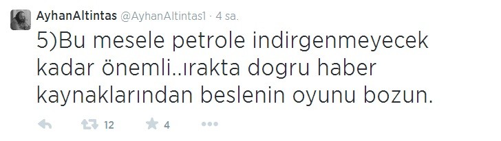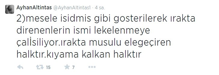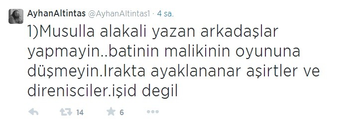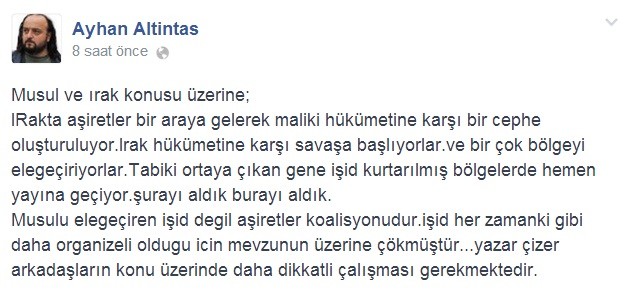 Ancak Suriye, Irak ve diğer Orta Doğu bölgelerinde yaşananlara dair, sosyal medyadan paylaştığı bilgilerle olayların doğrultusunun hiç de medyada yansıtıldığı gibi olmadığını iddia eden Ayhan Altıntaş, IŞİD'in Musul'u ele geçirdiği haberleri üzerine de ezber bozan bir açıklama yaptı. Altıntaş, Musul'da IŞİD'in olmadığı, aşiretlerin Maliki'ye karşı ayaklandığını, IŞİD'in elindeki medya gücü ile bu olayların üzerine yattığını ifade etti.