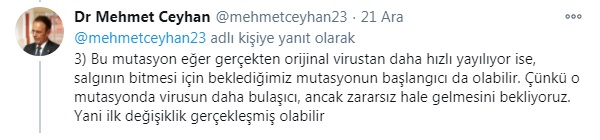 Salgınla birlikte kamuoyunun en çok takip ettiği isimlerden biri olan Enfeksiyon Hastalıkları Derneği Başkanı Prof. Dr. Mehmet Ceyhan sosyal medya hesabından yaptığı paylaşımla dikkatleri çekti. Ceyhan paylaşımında söz konusu mutasyonu değerlendirdi ve “Eğer gerçekten orijinal virüsten daha hızlı yayılıyor ise salgının bitmesi için beklediğimiz mutasyonun başlangıcı da olabilir” ifadelerini kullandı.