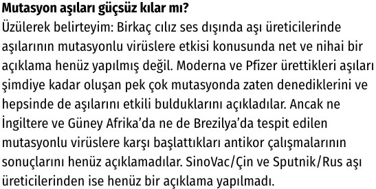 Sağlık Bakanı Fahrettin Koca, "Riskli mutasyonlar sınır tanımadan yayılıyor. Ülkemizdeki İngiltere mutasyonu 196 oldu. İki Güney Afrika, bir de Brezilya varyantı ile karşılaşıldı" açıklamasında bulundu. Bilim Kurulu Üyesi ve Ankara Şehir Hastanesi Yoğun Bakım Uzmanı Doç. Dr. Sema Turan, mutasyonlu virüs görülen kent sayısının 23'e yükseldiğini belirtti. Turan, virüslerin doğada var olabilmesi için daima kendilerinde bir değişim yaratmaları gerektiğini ifade etti.