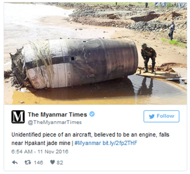 Myanmar’da faaliyetlerini sürdüren Myanmar Times, Hpakant yeşim madeninin yakınına tanımlanamayan bir cismin düştüğünü duyurdu. Görünüşüyle bir uçak parçasını andıran bu cisim, bölgeye gelen askerler tarafından incelendi ancak cismin ne olduğuyla ilgili net bir çıkarım yapılamadı.