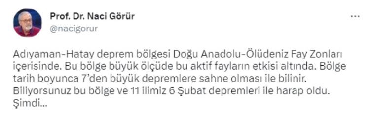 Görür, paylaşımlarında şu uyarılara yer verdi: "Adıyaman-Hatay deprem bölgesi Doğu Anadolu-Ölüdeniz Fay Zonları içerisinde. Bu bölge büyük ölçüde bu aktif fayların etkisi altında. Bölge tarih boyunca 7'den büyük depremlere sahne olması ile bilinir. Biliyorsunuz bu bölge ve 11 ilimiz 6 Şubat depremleri ile harap oldu.