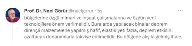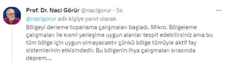 Yeniden yapılaşma çalışmalarına karşı, deprem bilimci Prof. Dr. Naci Görür'den dikkat çeken uyarılar geldi. Bölgenin tümüyle aktif fay sistemlerinin etkisi altında olduğunu vurgulayan Naci Görür, Twitter hesabından paylaşımlar yaptı.