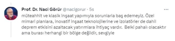 Bu bölgede alışılagelmiş ihale, müteahhit ve klasik inşaat yapımıyla sorunlarla baş edemeyiz. Özel mimari planlara, inovatif inşaat teknolojilerine ve izolatörler de dahil deprem etkisini azaltacak yatırımlara ihtiyaç vardır.Belki pahalı olacaktır ama burası herhangi bir bölge değildir."