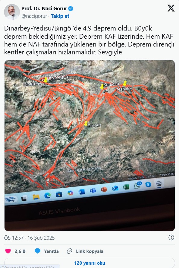 Görür, paylaşımında şu ifadelere yer verdi: "Dinarbey-Yedisu/Bingöl’de 4,9 deprem oldu. Büyük deprem beklediğimiz yer. Deprem KAF üzerinde. Hem KAF hem de NAF tarafında yüklenen bir bölge. Deprem dirençli kentler çalışmaları hızlanmalıdır. Sevgiyle."