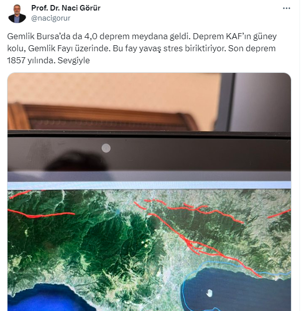 Prof. Dr. Naci Görür, mesajında, "Gemlik Bursa’da da 4,0 deprem meydana geldi. Deprem KAF’ın güney kolu, Gemlik Fayı üzerinde. Bu fay yavaş stres biriktiriyor. Son deprem 1857 yılında. Sevgiyle" dedi.