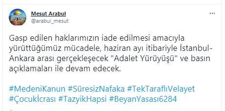 Sosyal medya hesabından açıklamada bulunan Süresiz Nafaka Mağdurları Platformu Kurucu Başkanı Mesut Arabul, “Gasp edilen haklarımızın iade edilmesi amacıyla yürüttüğümüz mücadele, Haziran ayı itibariyle İstanbul-Ankara arası gerçekleşecek. "Adalet Yürüyüşü" ve basın açıklamaları ile devam edecek” dedi.