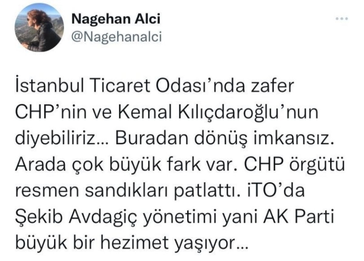 Türkiye'nin en büyük odası olan İstanbul Ticaret Odası'nda yapılan seçimi 195 üyeyle ve farkla Şekip Avdagiç ve ekibi kazandı. "CHP örgütü resmen sandıkları patlattı. İTO'da Şekib Avdagiç yönetimi yani AK Parti büyük bir hezimet yaşıyor" diyen Nagehan Alçı'nın kendisi patladı.