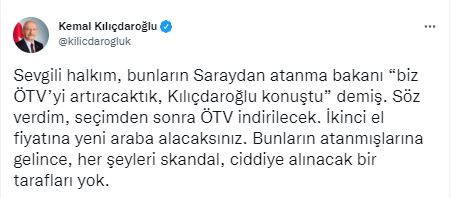 Resmi sosyal medya hesabından açıklama yapan CHP Genel Başkanı Kemal Kılıçdaroğlu, “Sevgili halkım, bunların Saraydan atanma bakanı “biz ÖTV’yi artıracaktık, Kılıçdaroğlu konuştu” demiş. Söz verdim, seçimden sonra ÖTV indirilecek. İkinci el fiyatına yeni araba alacaksınız. Bunların atanmışlarına gelince, her şeyleri skandal, ciddiye alınacak bir tarafları yok.” diyerek ilgi toplamaya çalıştı.