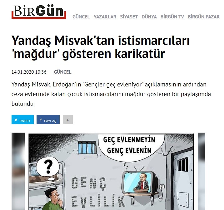 Paçavra Birgün, Misvak Dergisi'nin genç evlilik mağdurlarına ilişkin çizdiği karitürleri, 'Yandaş Misvak'tan istismarcıları 'mağdur' gösteren karikatür.' başlığı ile haberleştirirken, namusları ile yuva kuran ve ardından hapse atılan genç evlilik mağduru erkekleri alçak ifadelerle hedef aldı.