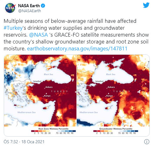 Amerikan Havacılık ve Uzay Dairesi (NASA) tarafından yayınlanan bir harita, Türkiye'deki kuraklık tehdidinin sadece barajlar için değil, aynı zamanda yer altı sularında da olduğunu gösterdi. Yayınlanan haritaya göre, Türkiye'nin büyük bir bölümünde yer altı suları ortalama seviyenin altında. Gravity Recovery and Climate Experiment Follow On (GRACE-FO) uydularıyla 11 Ocak 2021 itibarıyla Türkiye'deki yer altı sularının durumu hesaplandığı haritaya göre; karedeki mavi kısımlar, normalden fazla su olan bölgeleri, kırmızı ve turuncu renkteki kısımlar ise normalden az su olan bölgeleri gösteriyor.