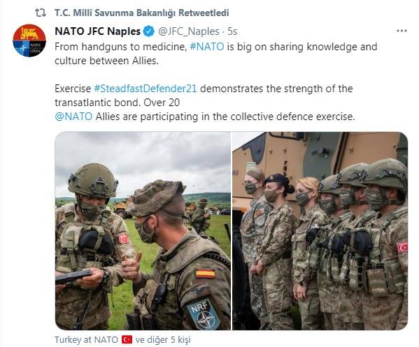 NATO paylaşımında Türkiye’nin ve Türk Silahlı kuvvetlerinin ne kadar geliştiğini de, “Tabancadan ilaca, #NATO Müttefikler arasında bilgi ve kültür paylaşımı konusunda büyük önem taşır. Egzersiz yapmak #SteadfastDefender21 transatlantik bağın gücünü gösterir. 20'den fazla @NATO Müttefikler toplu savunma tatbikatına katılıyor.” ifadeleriyle anlattı.