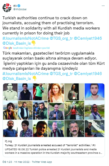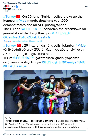 Batı’dan aldığı paralarla Türkiye’de Cumhur iktidarına yıkıcı muhalefet yürüten ve İP’çi Akşener’in kürsüsünde boy gösteren Nazmi Bilgin’in İstanbul’daki yasadışı LGBT yürüyüşü dolayısıyla uygulanan gözaltı işlemlerini kınayıp, terör suçlamasıyla cezaevlerinde bulunan sözde gazeteci PKK yandaşları için “dayanışma” mesajı paylaştığı bildirildi. Paris merkezli Uluslararası Gazeteciler Federasyonu’nun (IFJ) paylaşımları üzerinden PKK yandaşlarına ve LGBT’ye destek veren Nazmi Bilgin’in başkanı olduğu Gazeteciler Cemiyeti’nin “retweet” yoluyla sayfasında yer verdiği paylaşımlar şunlar: “26 Haziran’da Türk polisi İstanbul Pride yürüyüşünü bölerek 200’ün üzerinde göstericiyi ve bir AFP fotoğrafçısını gözaltına aldı. IFJ ve EFJEUROPE gazetecilere işlerini yaparken uygulanan baskıyı kınıyor.” (28 Haziran 2022) “Türk makamları, gazetecileri terörizm uygulamakla suçlayarak onları baskı altına almaya devam ediyor. İşlerini yaptıkları için şu anda cezaevinde olan tüm Kürt medya çalışanları ile dayanışma içindeyiz.” (14 Haziran 2022)