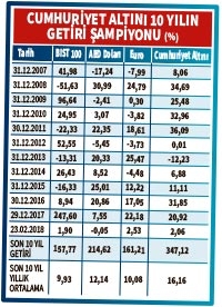 Cumhuriyet altını yatırımcısına yıllık ortalama yüzde 16 oranında getiri sağladı. Parasını dolarda değerlendirenler son 10 yılda, yıllık ortalama yüzde 12 getiri elde ederken euro’ya yatırım yapanlar yıllık ortalama yüzde 10, borsaya yatırım yapanlar ise yıllık ortalama yüzde 9 kazandı. Bu dönem içerisinde yabancı payı en düşük yüzde 62 seviyesini gördü.