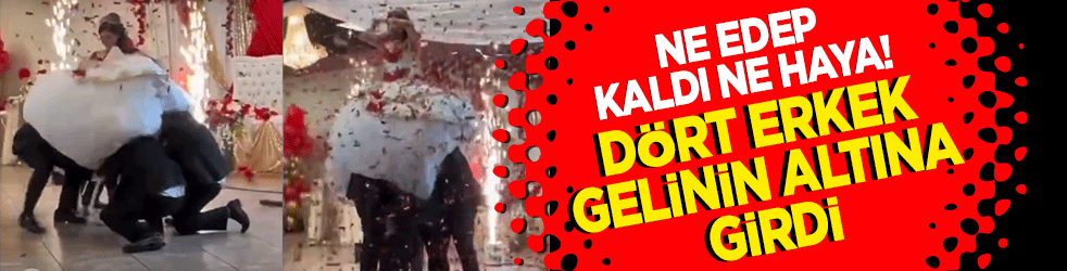 Sosyal medyada yayılan bir video izleyenleri şaşırttı. Bir düğünde dört erkek gelinin altına girerek havaya kaldırdı. Görenler edep ve hayanın kalmadığını dile getirdiler.