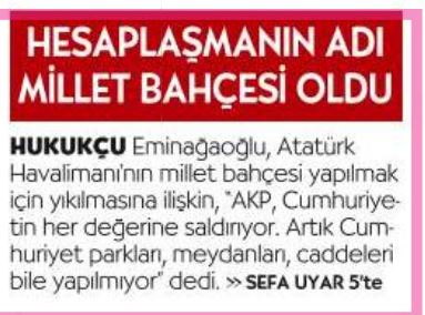 Türkçe ezan ve Türkçe ibadet yapılması konusunda skandal çıkışları bulunan, ortaöğretim ve beşinci sınıfta başörtüsü serbestisini getiren düzenlemenin iptali için Danıştay'a dava açan, kamuda çalışanlara cuma namazı iznini getiren düzenlemeye karşı çıkan azılı İslam karşıtı Eminağaoğlu, Atatürk Havalimanı'nın yerine yapılacak millet bahçesiyle ilgili akla ziyan ifadeler kullandı.