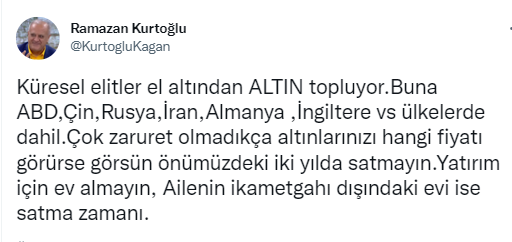 Sosyal medya hesabından bir paylaşım yapan Kurtoğlu, "Küresel elitler el altından altın topluyor. Buna ABD, Çin, Rusya, İran, Almanya ,İngiltere vs. ülkelerde dahil. Çok zaruret olmadıkça altınlarınızı hangi fiyatı görürse görsün önümüzdeki iki yılda satmayın. Yatırım için ev almayın. Ailenin ikametgahı dışındaki evi ise satma zamanı." dedi.