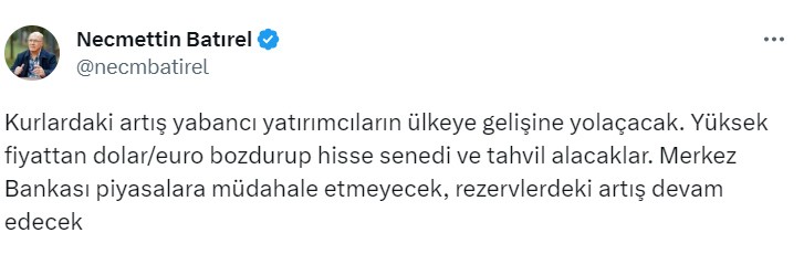 Doları olanın kaybedeceğini tahmin eden ekonomist Necmettin Batırel, son ekonomi politikalarını ve dolar kurunu değerlendirdi. Sosyal medya hesabından şu ifadeleri paylaştı!
